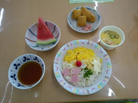 今年も七夕をイメージした鮮やかなそうめんと玉子巻きずし、スイカ等を提供して頂きました。