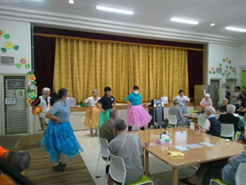 食堂にて誕生日会・七夕まつりを行いました。七夕まつりでは、民踊部の踊りを披露して頂き、一部の利用者さんと職員さんより七夕の願い事を伺いました。午後からは、食堂スタッフによるアイスパーティーを行いました。
